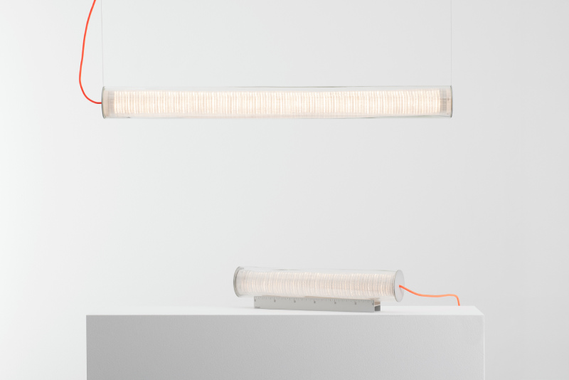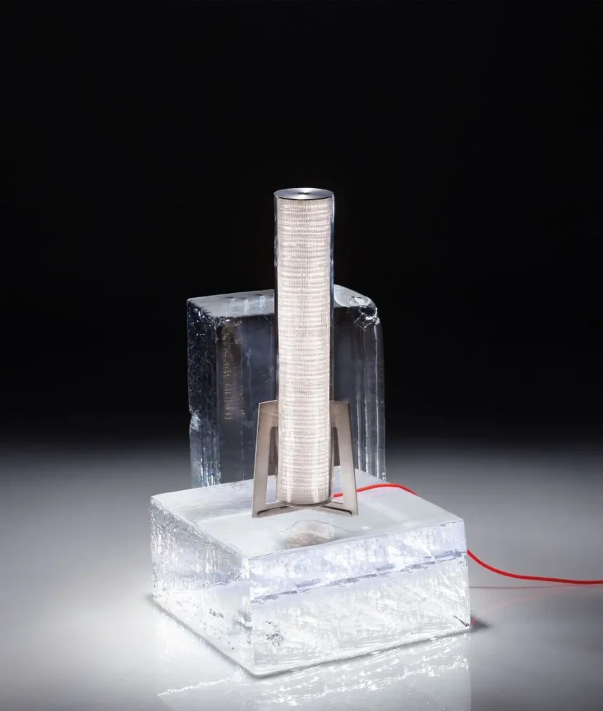 Αντίθετα, η Criosfera αναζητά τη σχέση του φωτός με τη μνήμη και το τοπίο, αντλώντας έμπνευση από τον πάγο της Ανταρκτικής — σύμβολο της κλιματικής ισορροπίας. Ο κύλινδρος από ανακυκλωμένο φυσητό γυαλί, χαραγμένος ενόσω είναι θερμός, διαχέει το φως με ποιητική απαλότητα, μετατρέποντας την επιστημονική έρευνα σε οπτική εμπειρία.