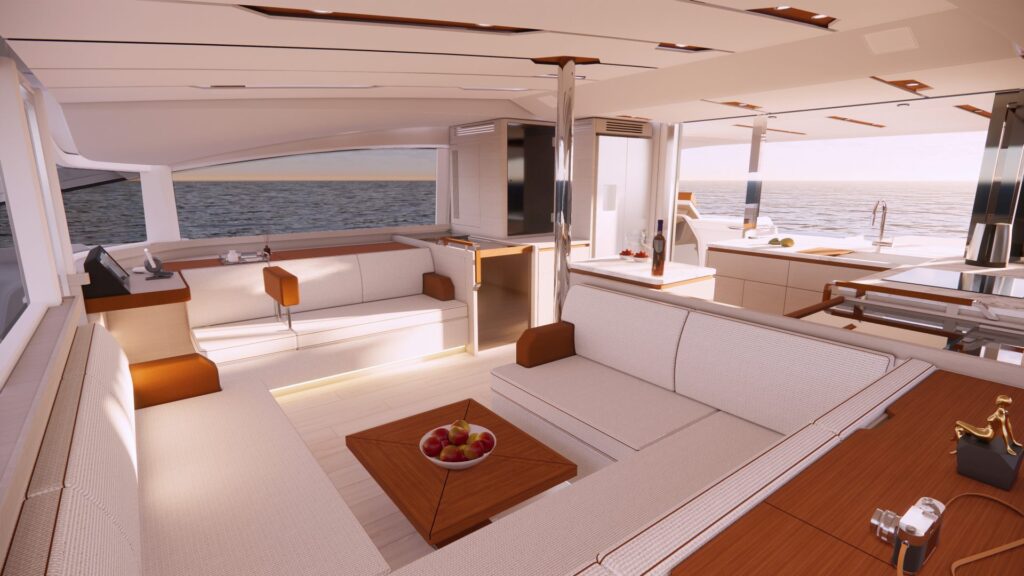 Together, these features create a modern, versatile space that emphasizes comfort without compromising the sailing experience.