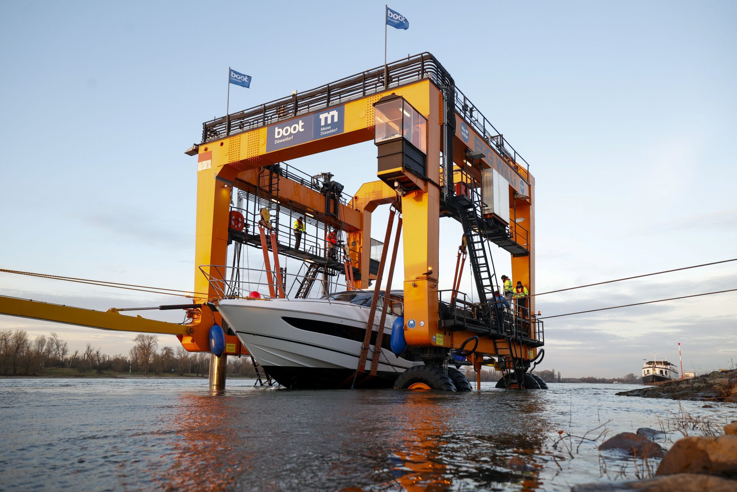 Standing 12.7 metres tall, 11.4 metres wide, and weighing 84 tons, the steel colossus has already “warmed up” over the past days — and on 16 December, it performs its first official workout for boot 2026, lifting four yachts out of the Rhine and onto dry land.