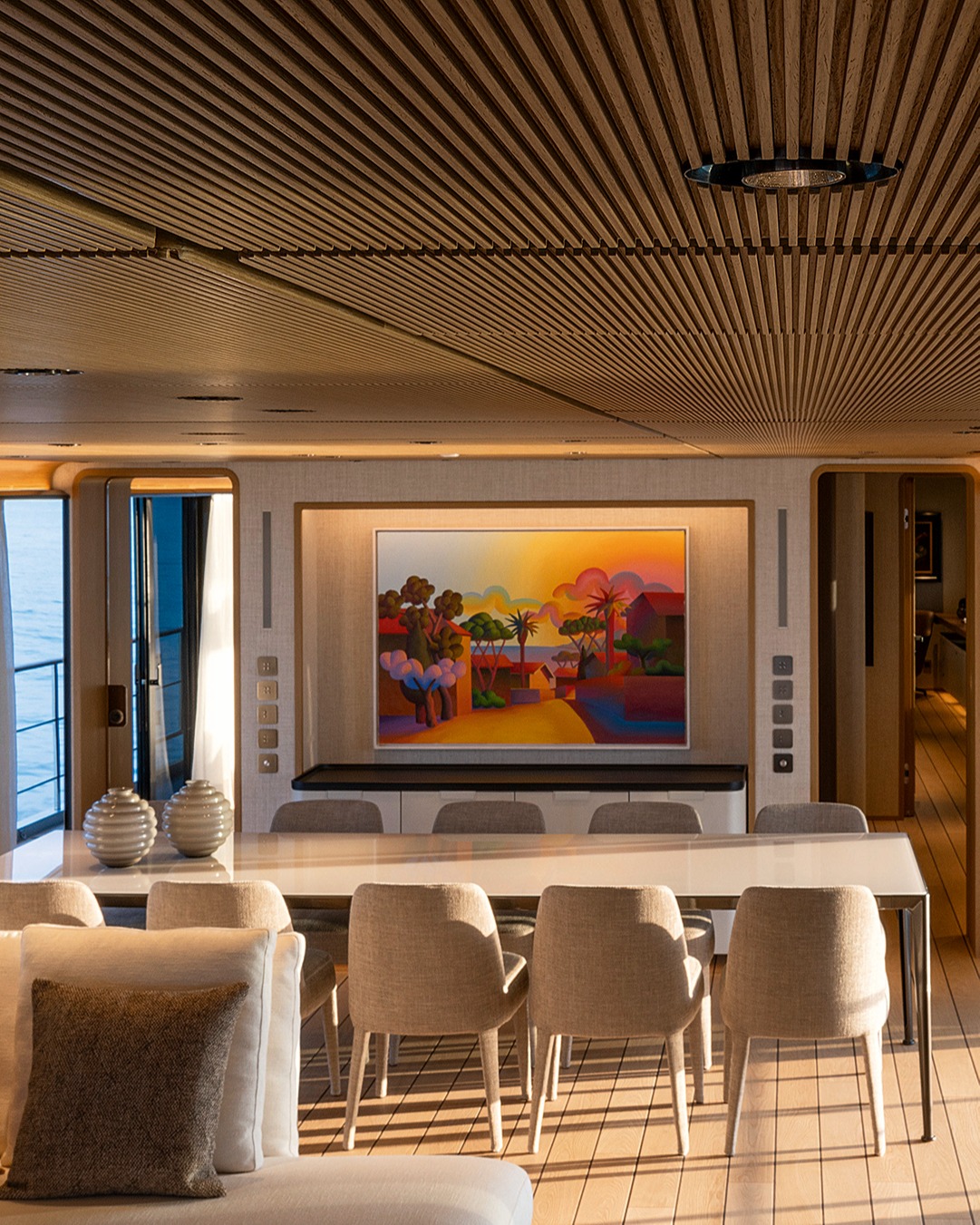 Accommodation is designed for up to 12 guests, with expansive living areas that prioritise openness and natural light. Large windows and carefully balanced proportions reinforce the feeling of connection to the surrounding seascape, while the overall layout supports both privacy and shared social spaces.
