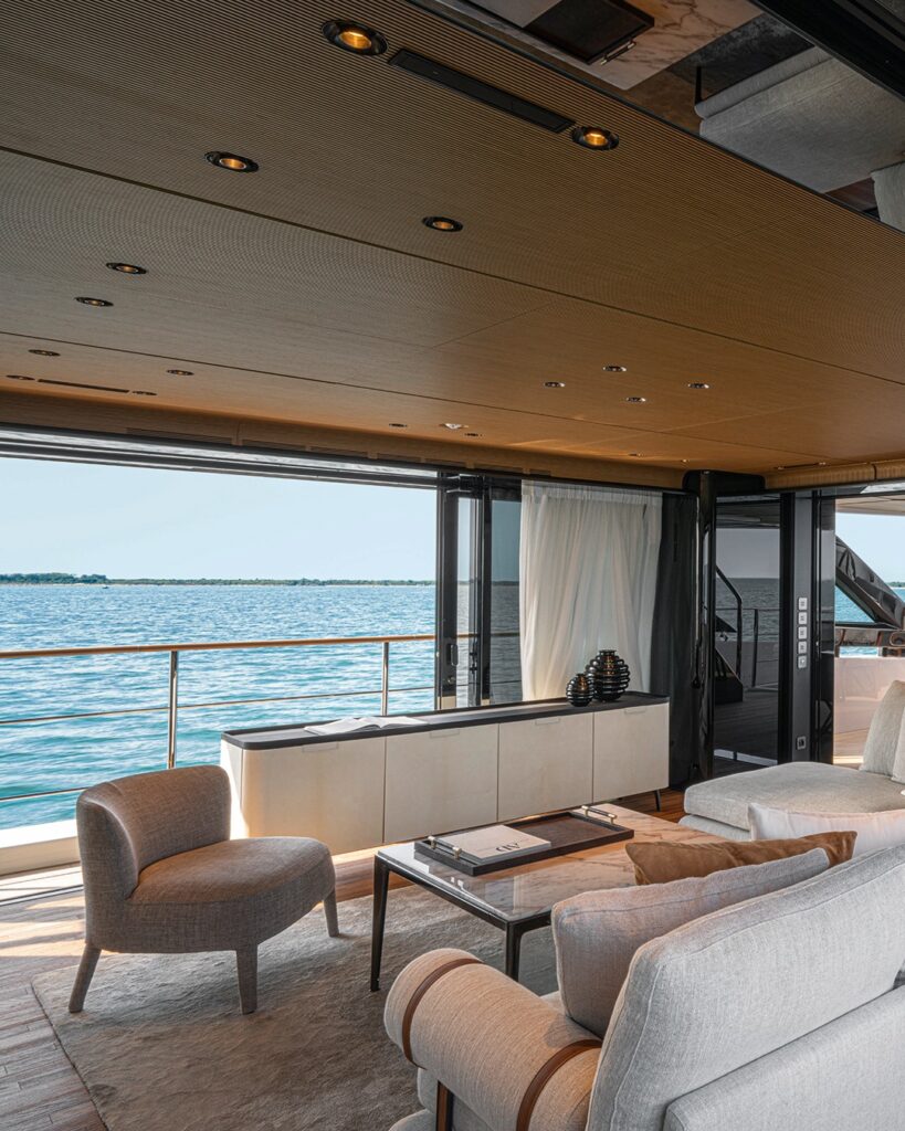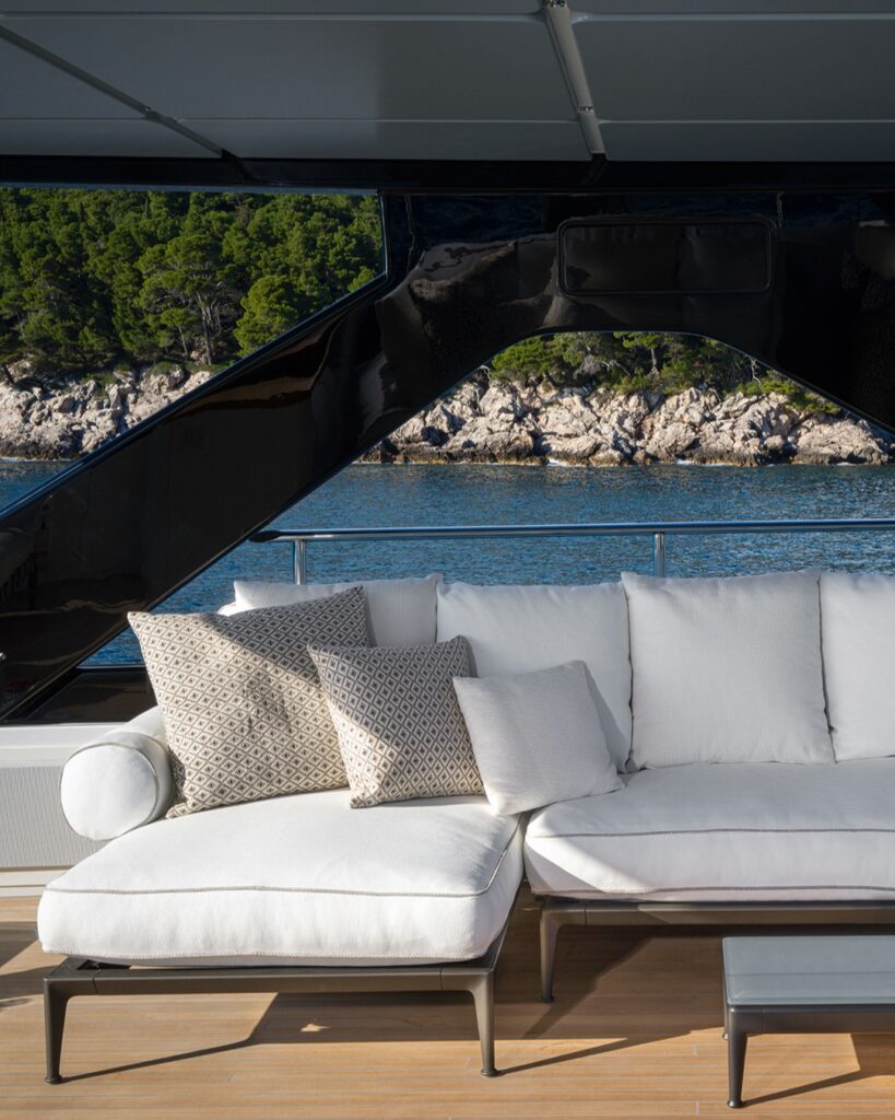 Across all three decks, the yacht’s interior and exterior spaces are furnished with pieces from B&B Italia, creating a cohesive aesthetic that seamlessly connects indoor and outdoor living areas. The result is a fluid spatial experience, where lounge areas, dining spaces and relaxation zones flow naturally into one another.