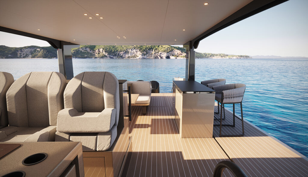 One of the Forte 47’s most unique features are its two long fold-out terraces positioned amidships rather than the conventional stern placement. These terraces open outward from beneath the hardtop, transforming the social heart of the yacht into a very spacious, sea-level lounge that evokes the feel of a floating villa. This innovative layout offers great indoor-outdoor living on a vessel of this size.
