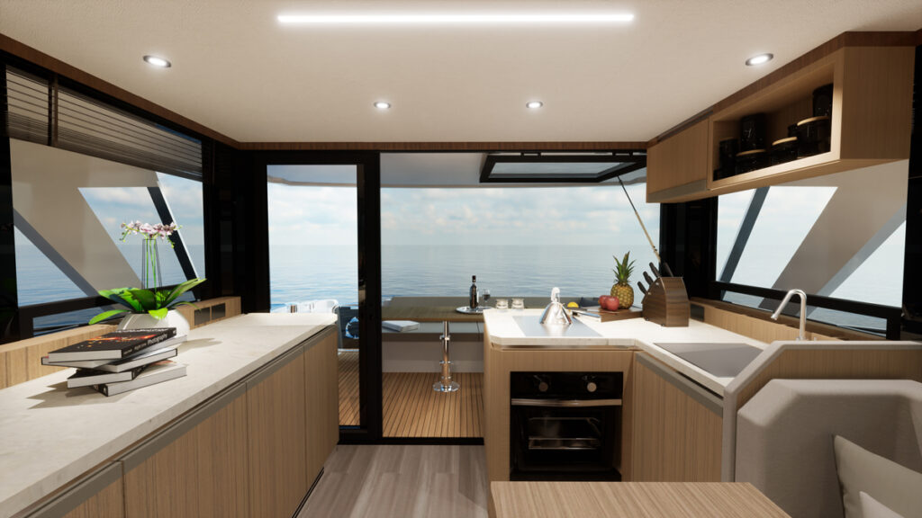 Versatility becomes central to the new model. The aft cockpit can be arranged in two different layouts, including a drop-down transom and removable furniture, while the foredeck lounge adds a functional social area. Interior styling by Marco Casali extends to two finishes and a broader palette of materials, with owners able to personalise cabins, bathrooms, furniture and appliances to a degree not previously offered in this size category.