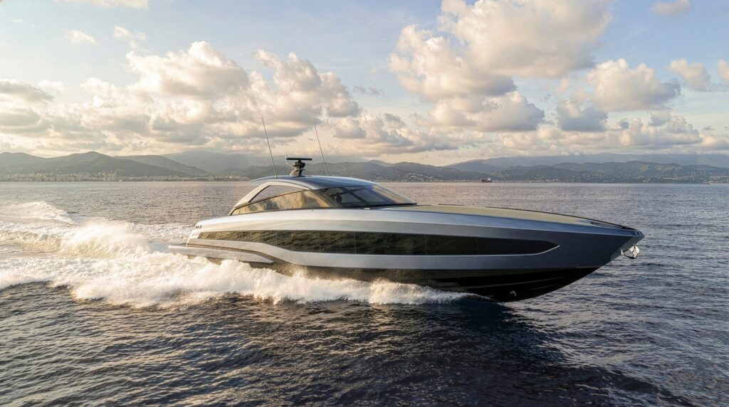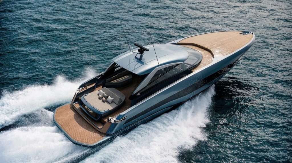 The yacht introduces a new design collaboration with Galeazzi Design, responsible for both exterior and interior architecture. The result is a contemporary interpretation of the luxury speed yacht: sharp surfaces, aggressive proportions and a visual language where every line is dictated by function and performance rather than decoration.