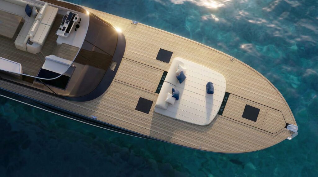 The helm station on the port side offers seating for two and excellent visibility, while access to the foredeck is positioned centrally near the windscreen. The entrance to the lower deck is located further starboard to improve circulation and onboard flow.