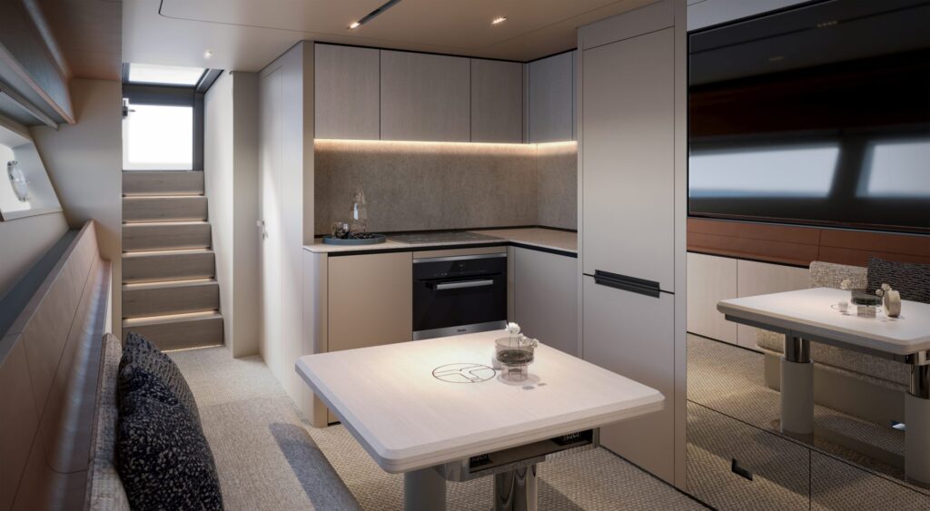 Large hull windows bring abundant natural light into the lower deck, while the elimination of internal steps ensures smoother movement throughout the space.