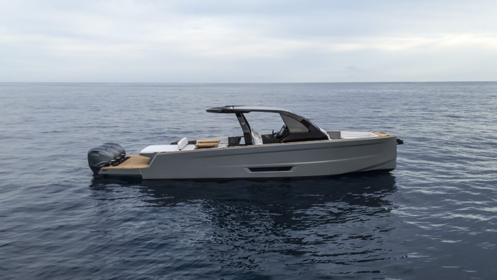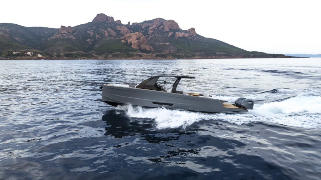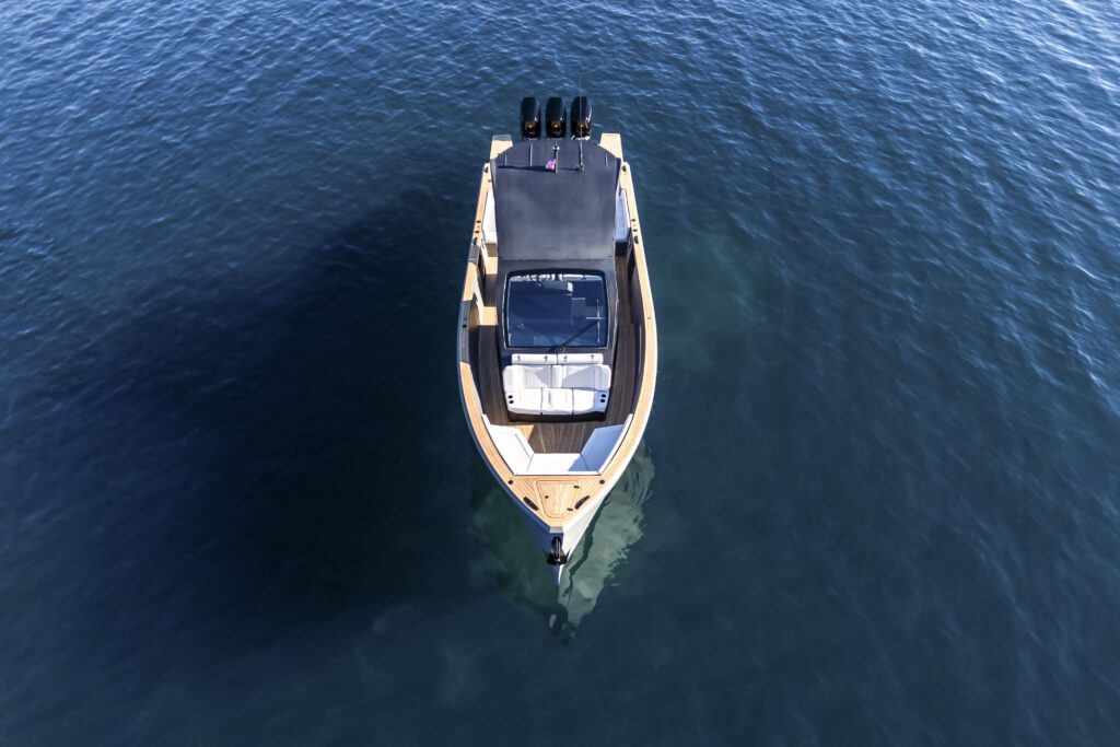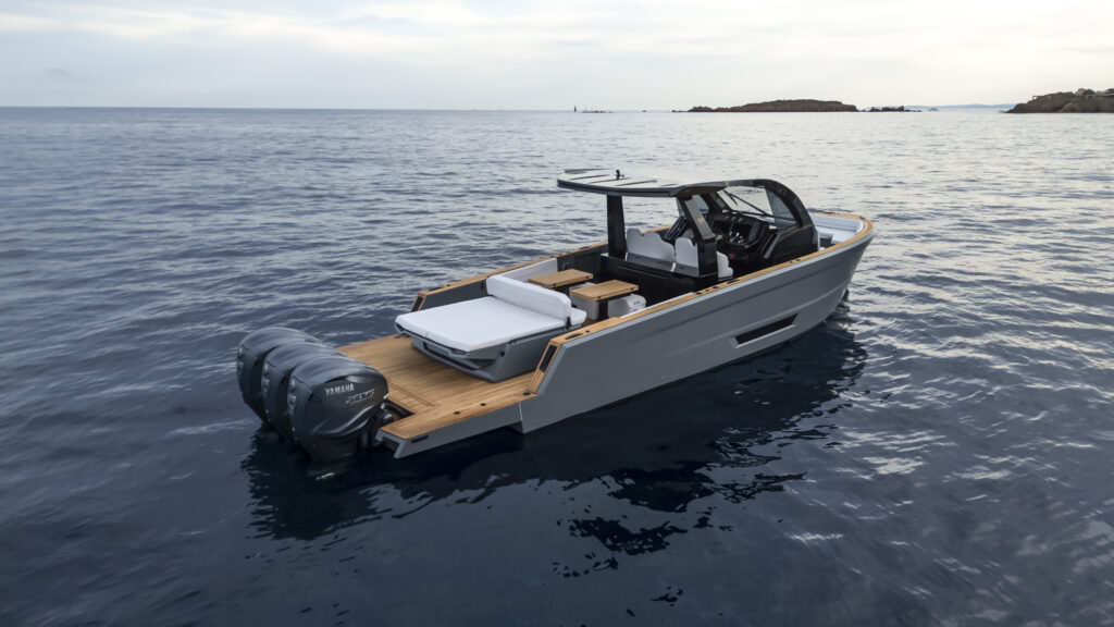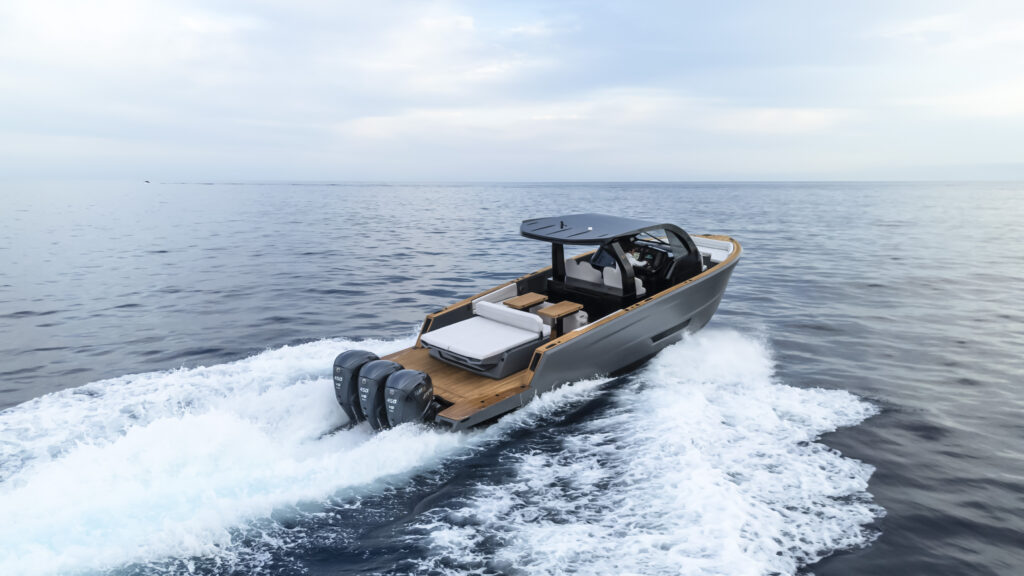 While the Düsseldorf model will mount three Yamaha engines, the boat can also be configured with three Mercury Verado V10 outboards at roughly 400 hp each.