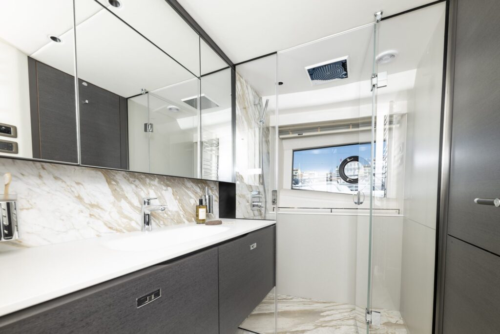 The lower deck features a full-beam VIP stateroom that can be transformed into two en suite double cabins, providing up to four elegant guest cabins in total. Crew quarters are located forward and include three cabins for five crew members, including a private Captain’s cabin and a welcoming crew mess.