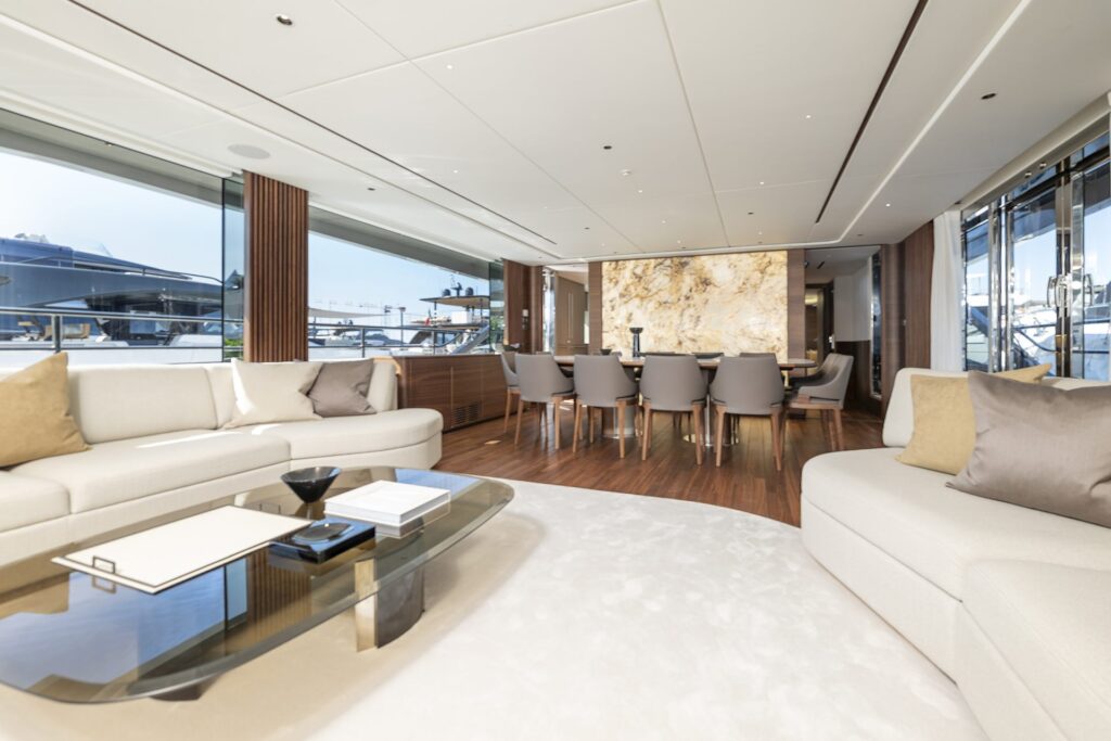 The main deck features an expansive cockpit and transom with flexible furniture and drop-down balconies designed to adapt effortlessly to every occasion. The owner’s suite includes a private lounge or ante-room, a dressing area, and a spa-inspired en suite bathroom, while the upper deck offers configurable layouts with bespoke furniture options, an optional spa bath, and floor-to-ceiling windows and skylights that create a bright, airy sanctuary. Elegant dining for up to ten guests can be enjoyed alfresco while remaining perfectly sheltered beneath the skylounge canopy.