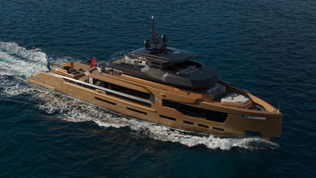 The concept draws inspiration from the form of an anvil, a starting point that translates into strong, sculptural lines and a distinctive stern profile. The result is a yacht that feels grounded and powerful, yet controlled and refined, balancing capability with a sense of quiet elegance.