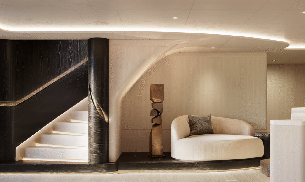Inspired by organic forms and textures, Winch Design’s interior for SKY evokes calm and connection. Natural light floods the full-beam owner’s suite, opening directly onto the vast aft beach deck. A midship wellness spa and watersports centre complement her tranquil aesthetic — a sanctuary at sea where sculptural lines meet quiet luxury.