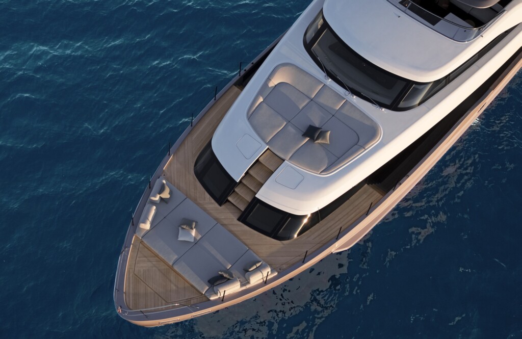 Exterior lines by Zuccon International Project structure the yacht across two and a half decks, incorporating an open flybridge, main deck and lower deck. The layout prioritises liveability, introducing solutions that redefine spatial perception within its size category and allow the yacht to adapt fluidly to the evolving rhythms of life onboard.