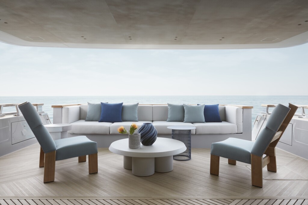 Flexibility is matched by meticulous attention to materials and details. Innovative furnishing solutions and adaptable configurations shape the interior environment, while refined elements such as the bronzed fluted glass used for the saloon’s forward wall enhance depth, light and atmosphere.