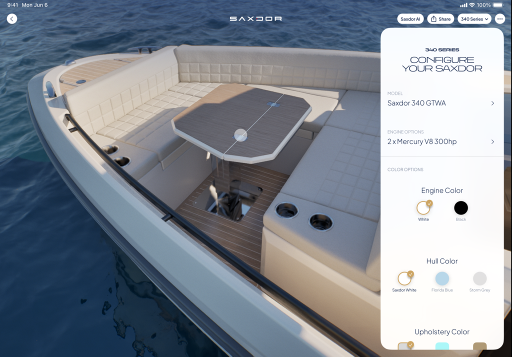Additionally, Saxdor is transforming the boat purchasing experience with its Digital Showroom, developed with Finnish technology company Younite AI. Using AI and digital twin technology, this immersive 3D environment lets customers explore, configure, and visualize Saxdor models in lifelike detail.
