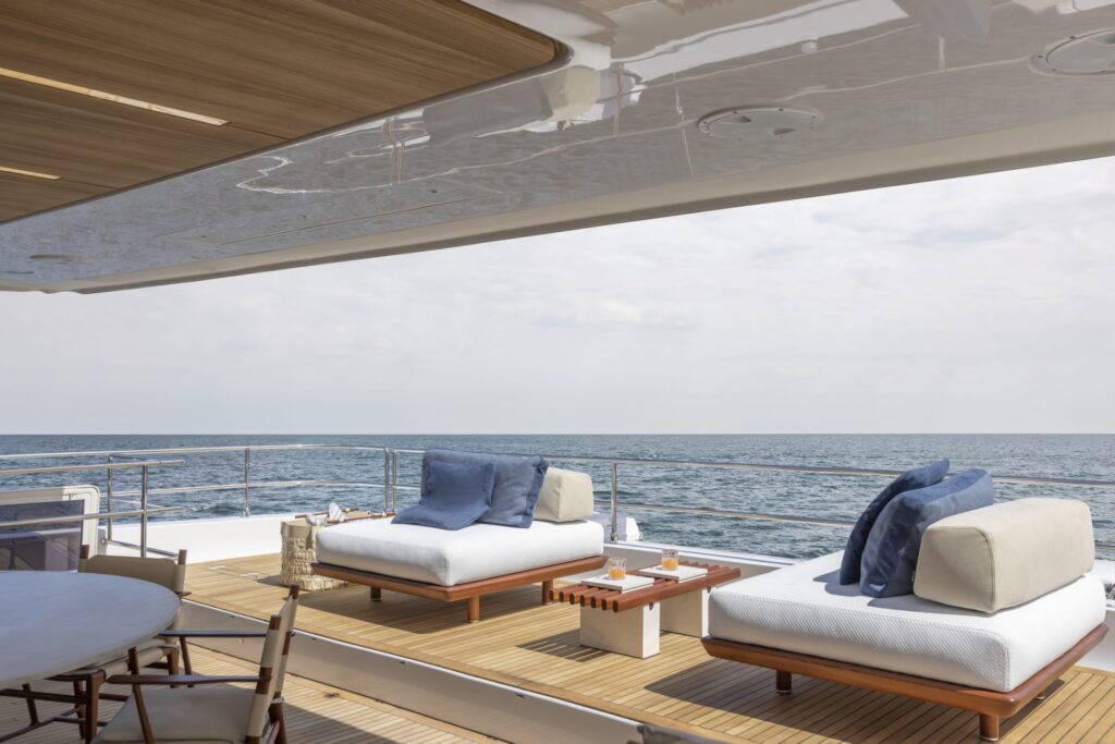 The 80 Sunreef Power represents the larger-scale proposition: an 80-foot catamaran with a bold superstructure, full-beam bow terrace complete with a spa pool, a large flybridge and a garage sized for serious water-toy programs. The model’s customizable architecture places owner lifestyle front and centre — from alfresco dining and lounging to long-range cruising capability.