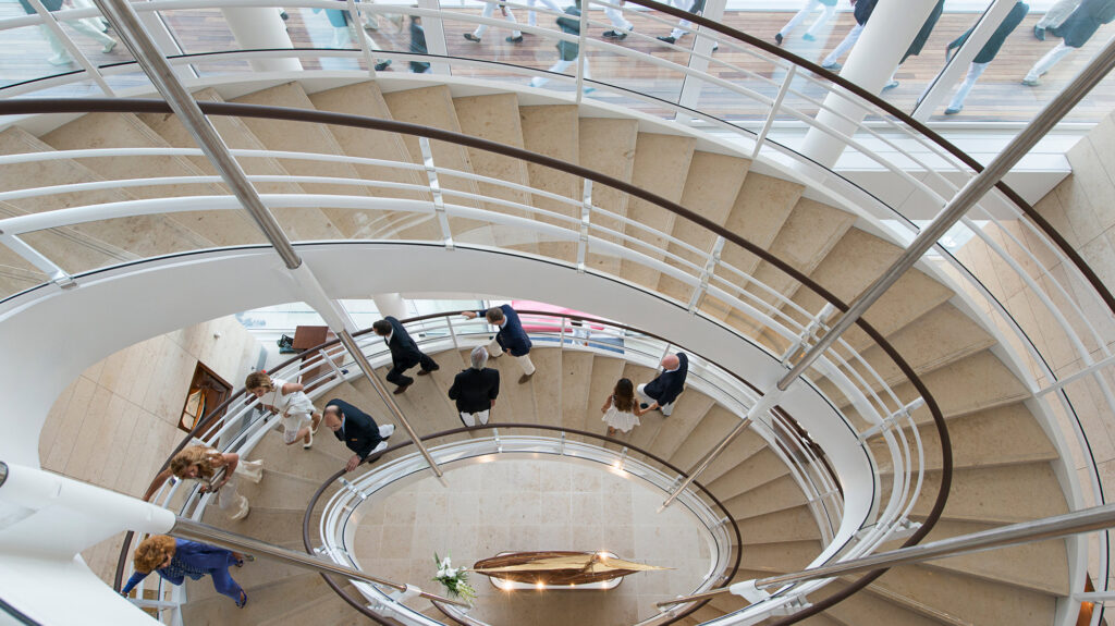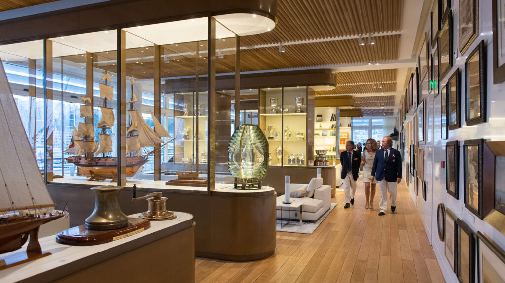 Inside, spaces unfold with the rhythm of maritime life. A glazed atrium frames vistas of the harbour and the palace beyond. The first floor houses the clubroom, bar, and restaurant; higher levels include a soaring function hall, guest cabins, and private quarters, while the top decks host versatile event venues shaded by sail-like fabric canopies.