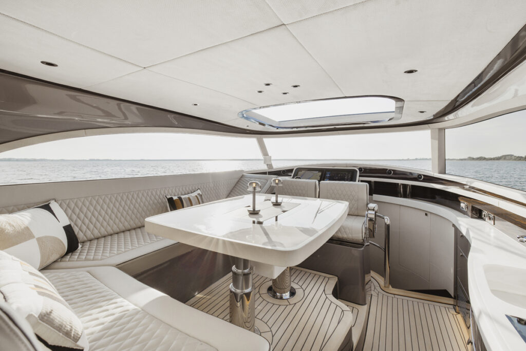 Although positioned as a dayboat, the interior elevates expectations. The deck saloon offers uninterrupted 360-degree views thanks to the elimination of traditional window mullions, creating a seamless visual connection with the sea. Deep sofas and a dining area for four transform the space into a refined social hub.